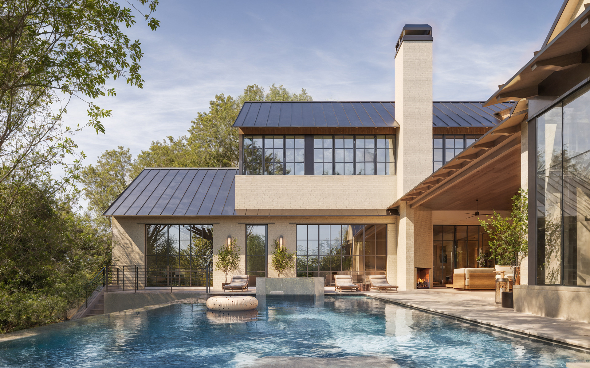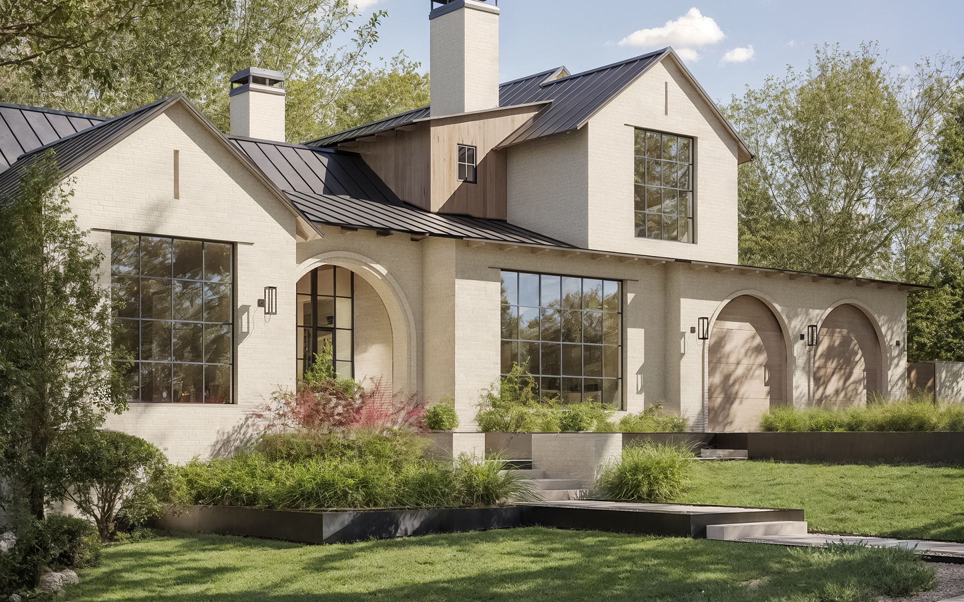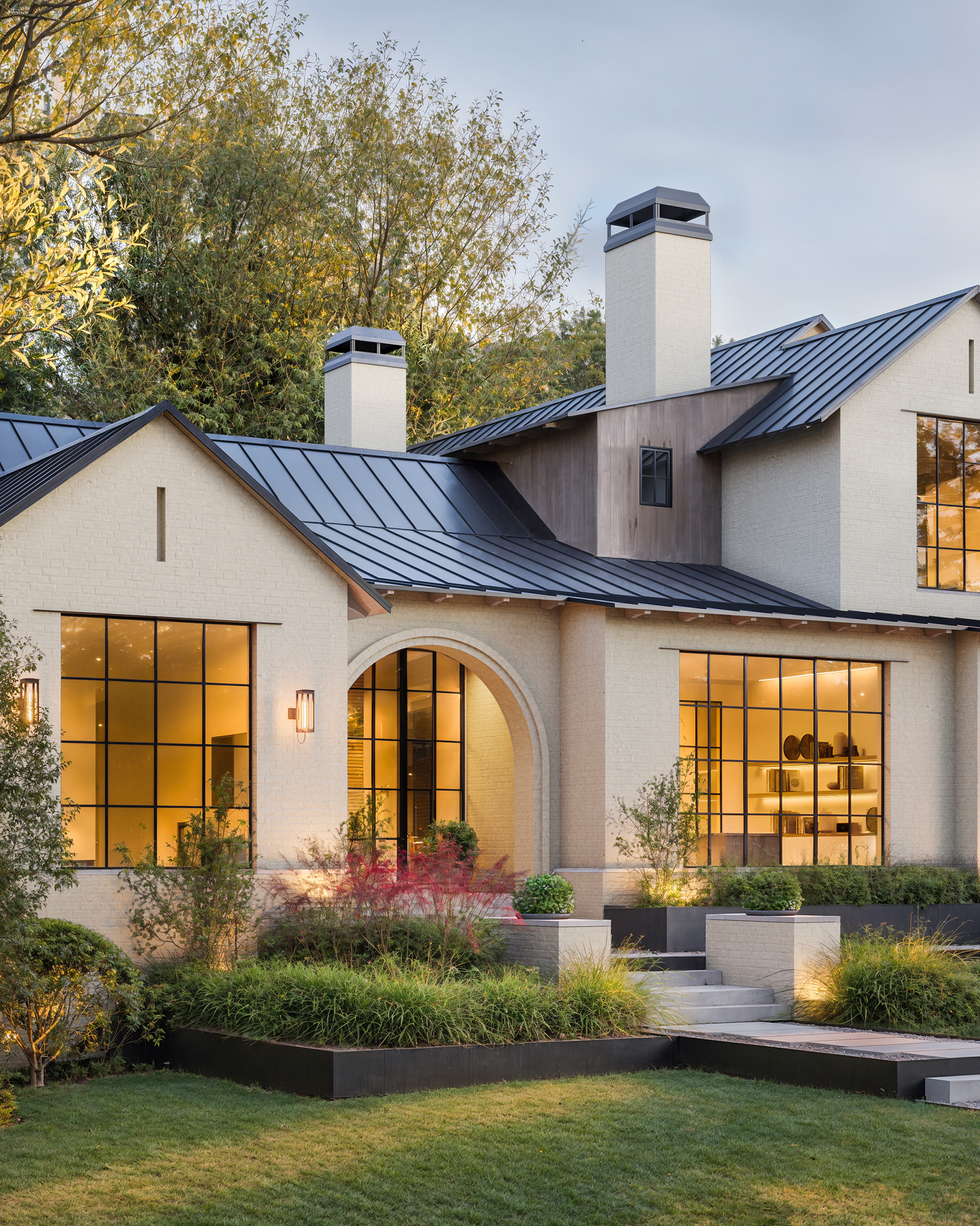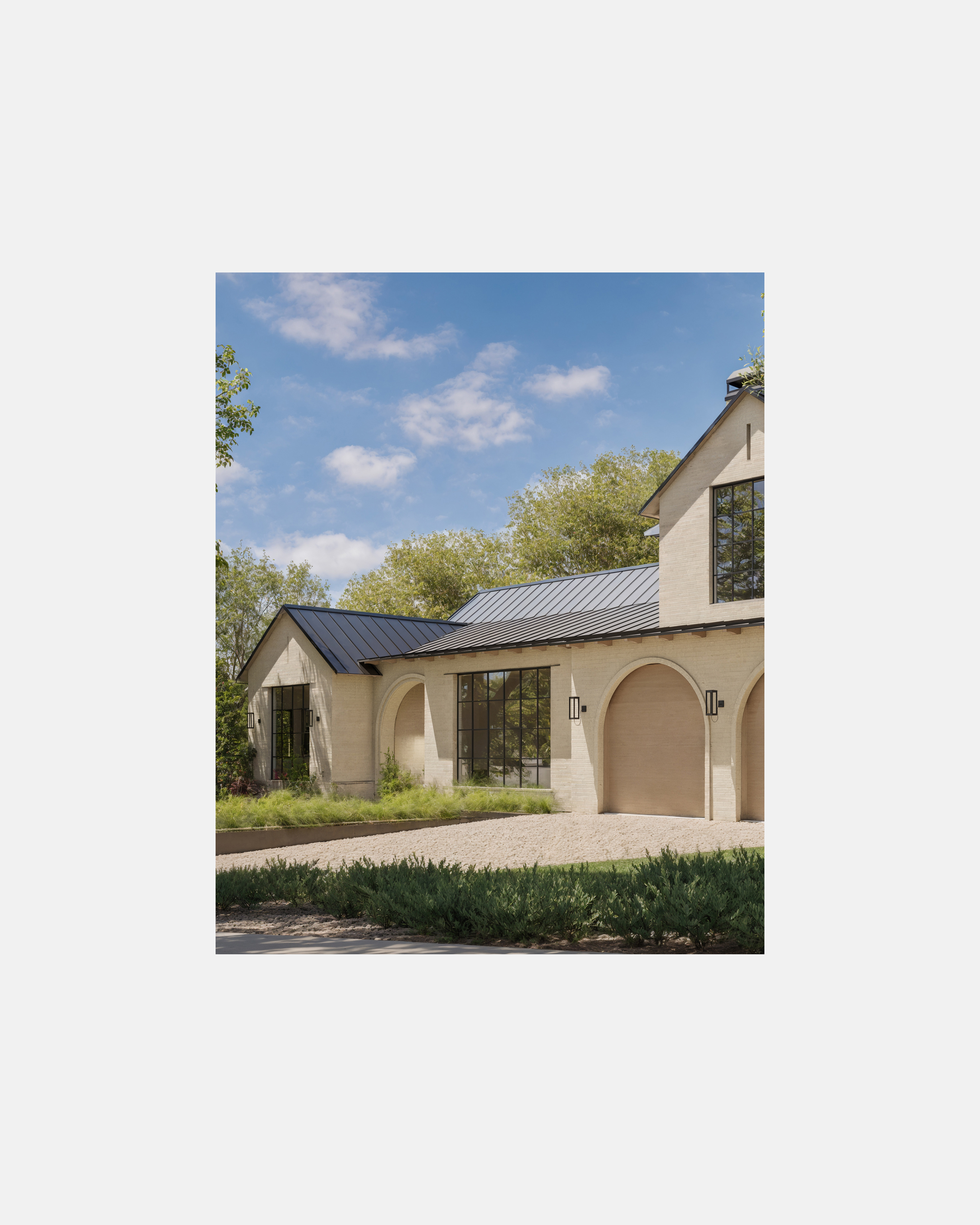 Located in Austin, TX, this residence blends traditional and contemporary design with refined simplicity. Gable roofs, arched openings, and a soft palette of painted brick and natural wood create a timeless architectural language. Expansive steel-framed windows and warm, minimalist interiors offer a modern take on classic elegance.