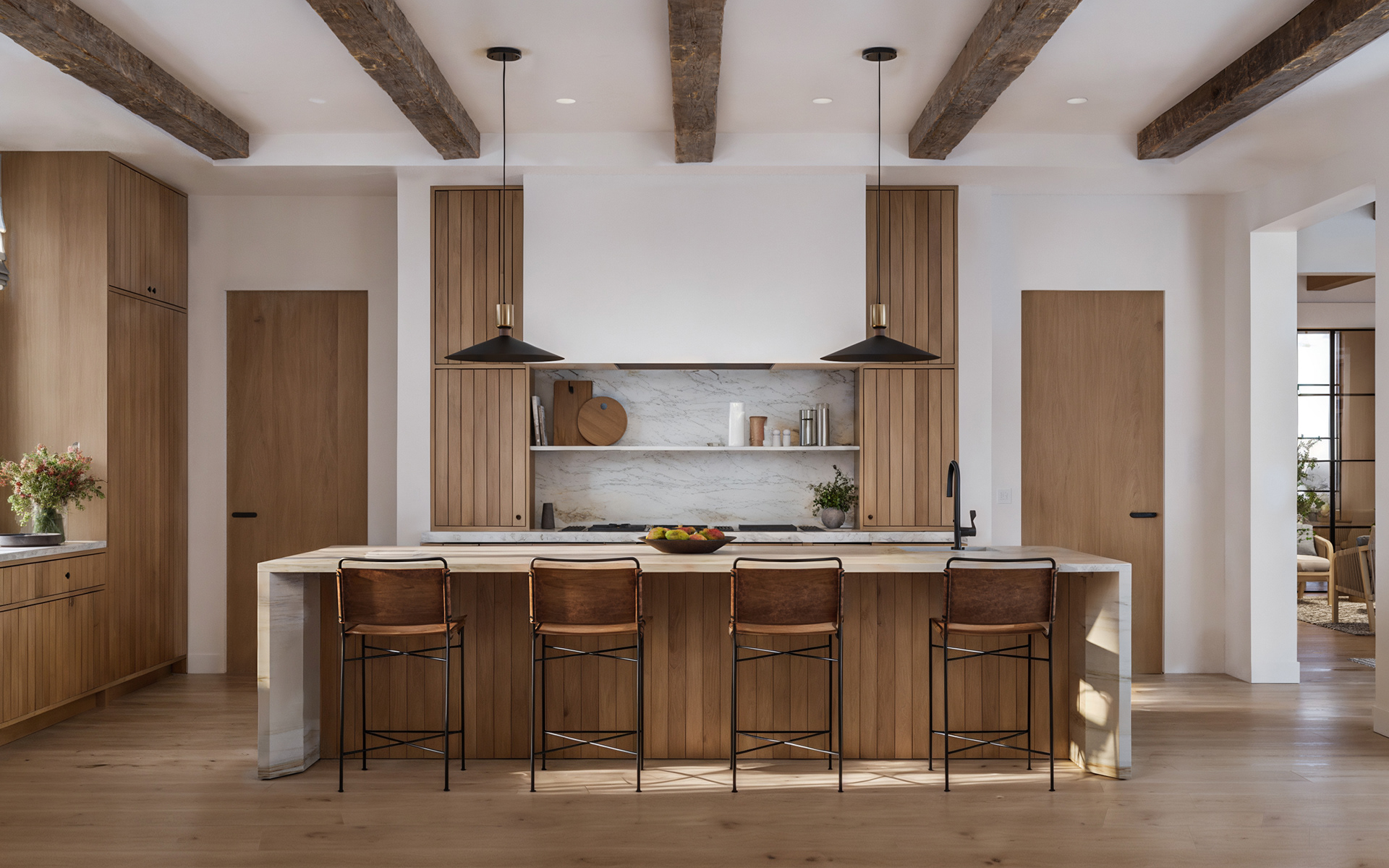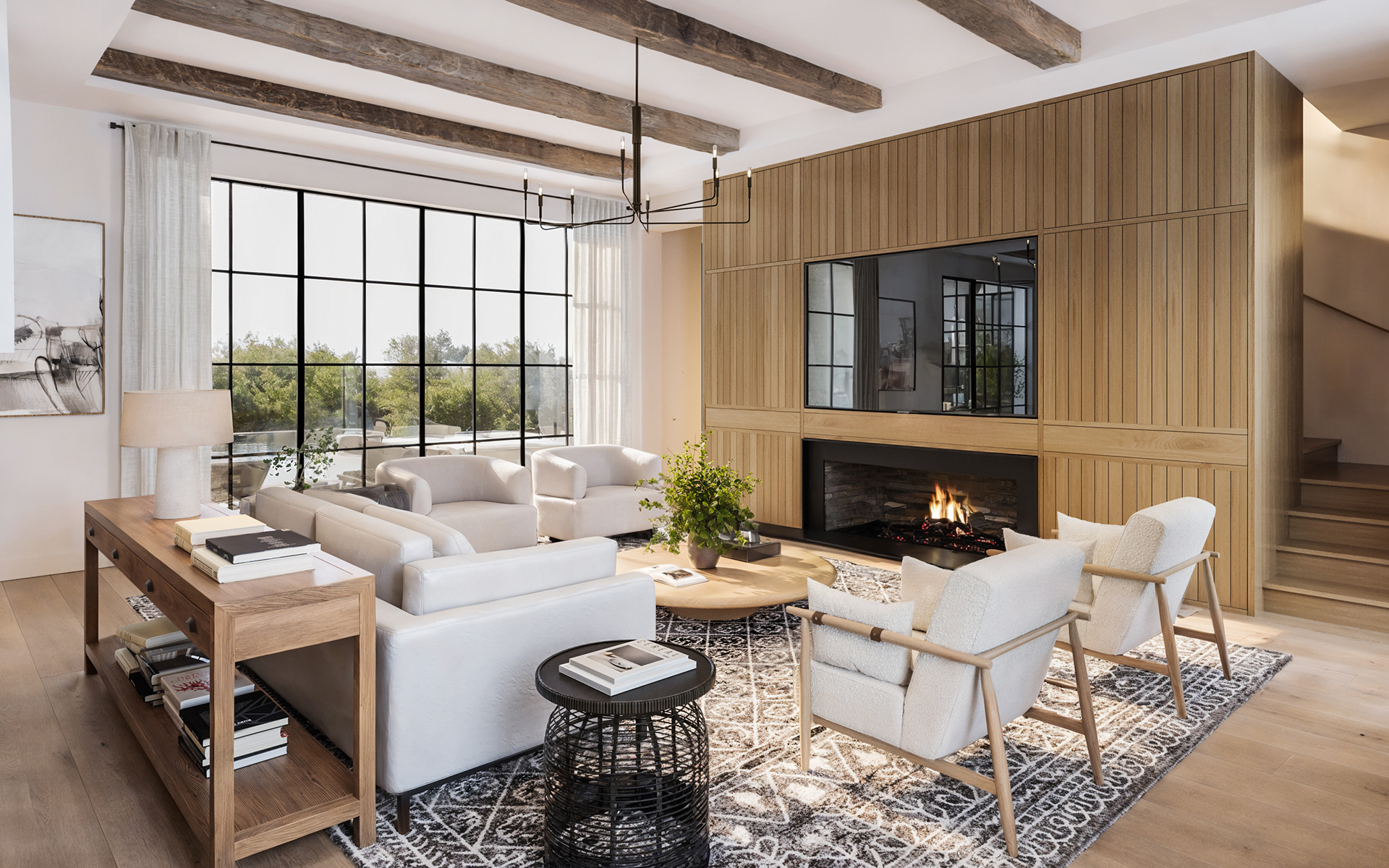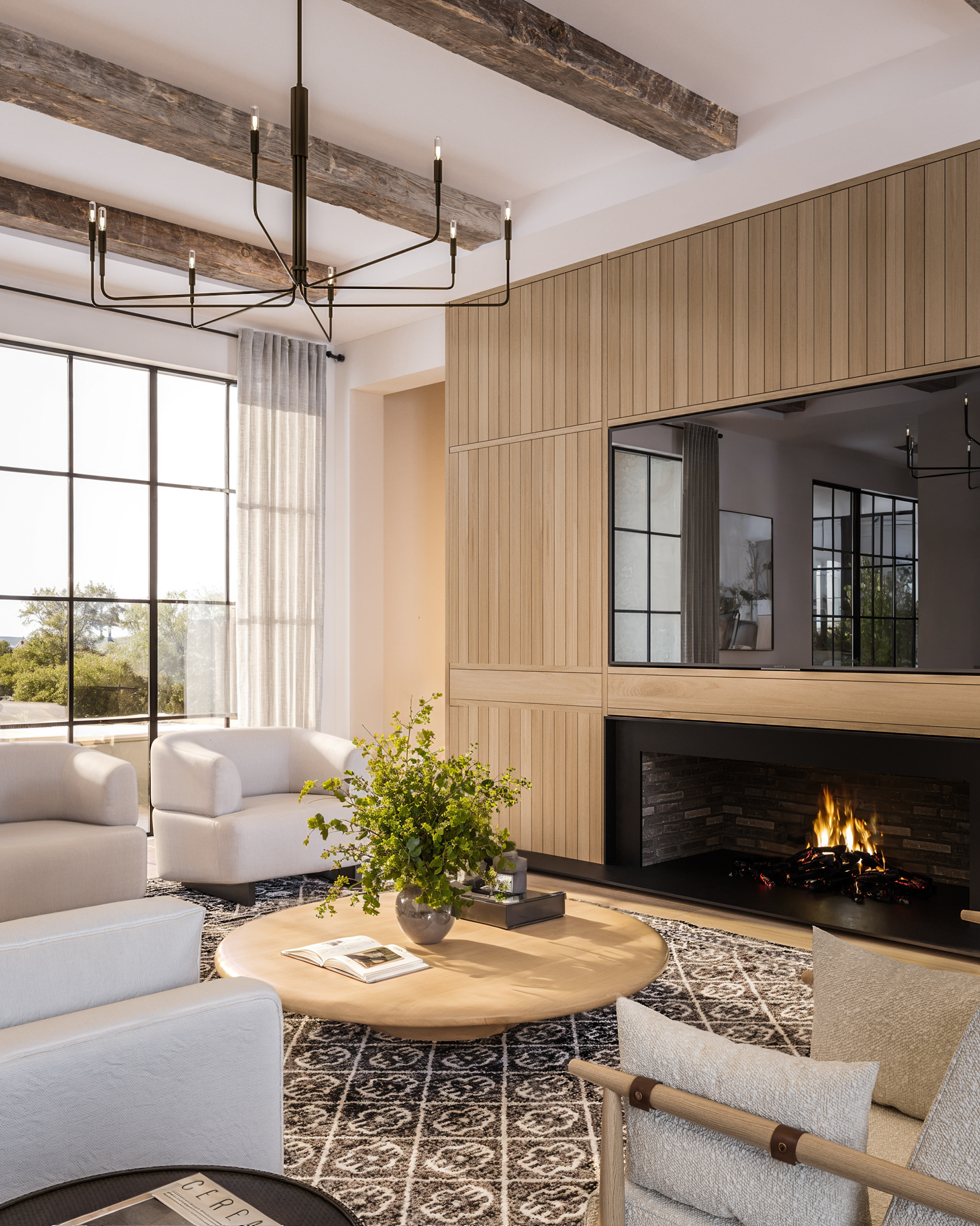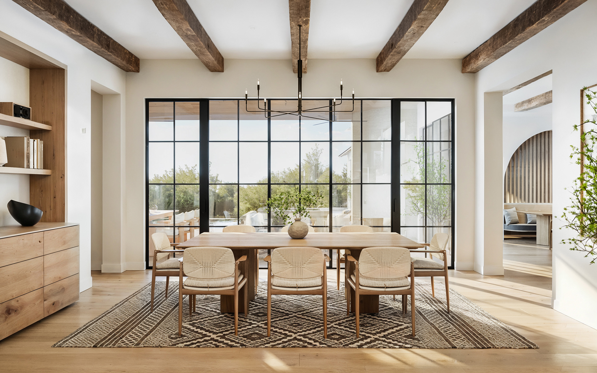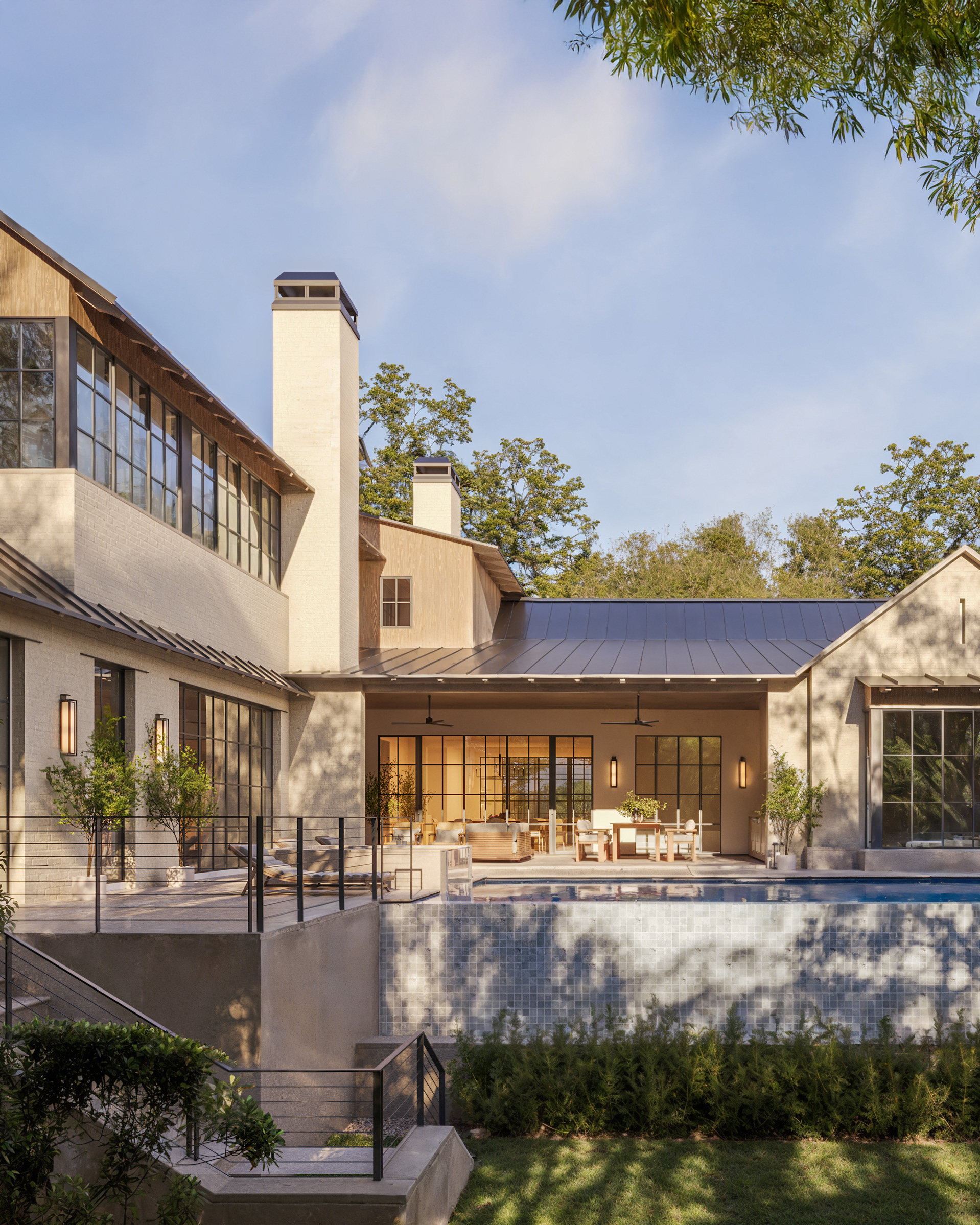 Located in Austin, TX, this residence blends traditional and contemporary design with refined simplicity. Gable roofs, arched openings, and a soft palette of painted brick and natural wood create a timeless architectural language. Expansive steel-framed windows and warm, minimalist interiors offer a modern take on classic elegance.