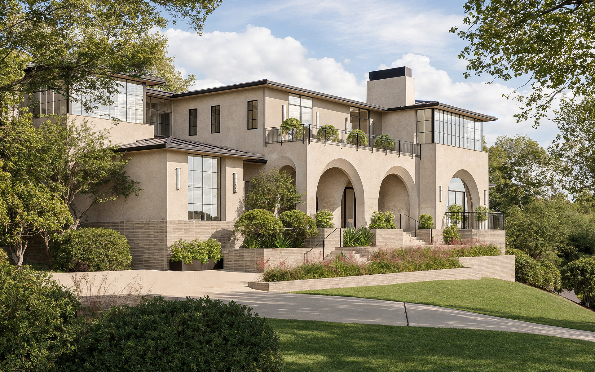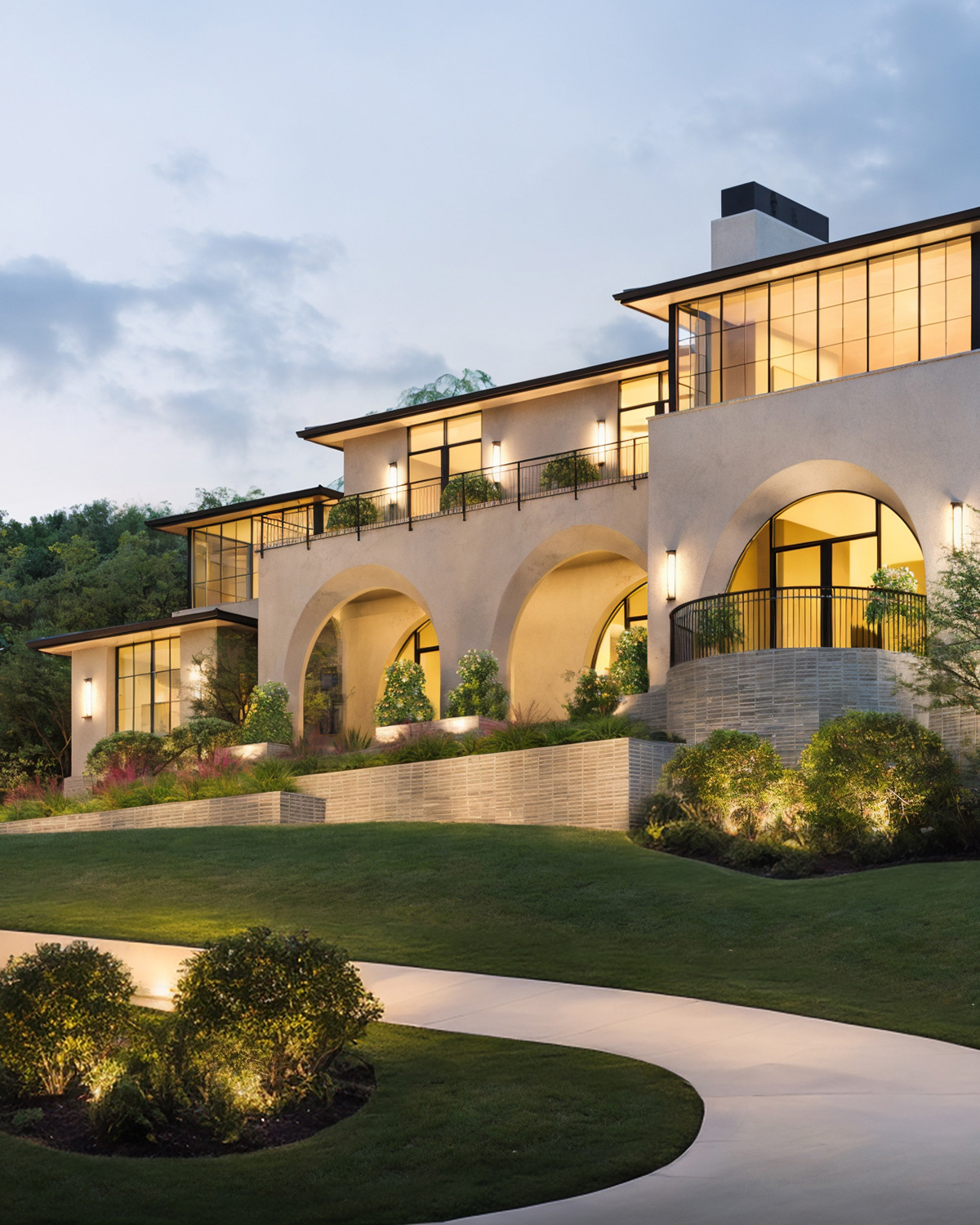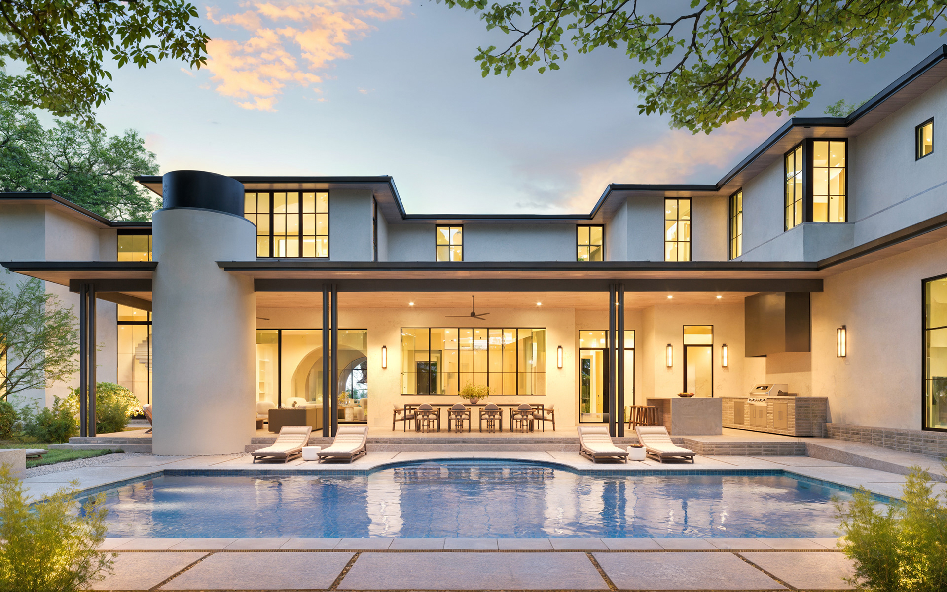 Designed for city views and entertainment, this residence in Austin, TX was carefully conceived with a timeless sense of materials and form. Steel windows and doors line the front and rear elevations giving an impression of quality and ageless style. Inspired by Mediterranean architecture, the design cross-pollinates aesthetics into a fresh stylistic approach. The layout responds to this same ethos and the arrangement translates well to family living, large parties, or small gatherings.